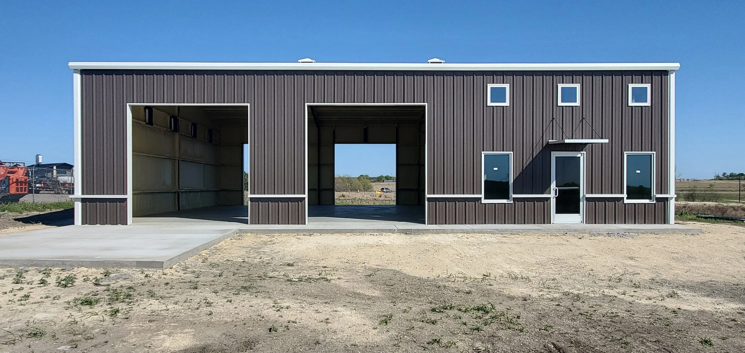 Bldg Exterior: R. Panel Metal Sheathing Side Walls with Native Stone Veneer. Front and Rear Grade Level Overhead Doors. R.Panel Metal Roofing.
